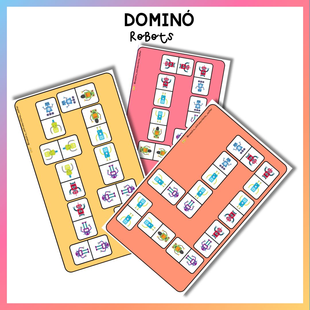 Este material manipulativo está diseñado para trabajar la discriminación visual, la atención sostenida y la lógica a través de un formato clásico como el dominó, adaptado con ilustraciones de robots.