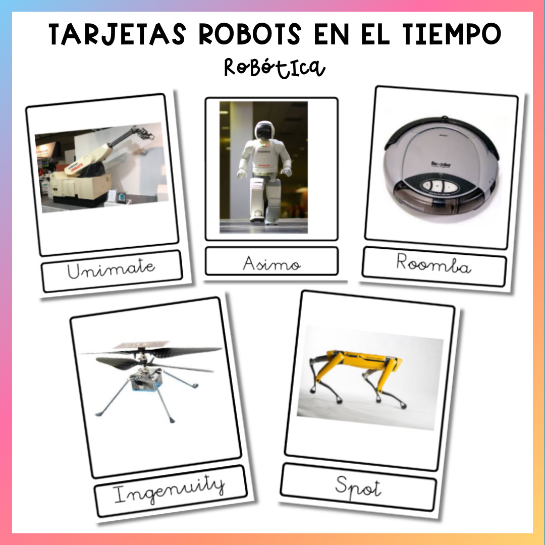 Cada tarjeta muestra el nombre y la imagen de un robot representativo —como Unimate, Asimo, Roomba, Ingenuity o Spot— para fomentar la curiosidad científica, el pensamiento cronológico y la observación tecnológica.